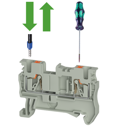 Der Pusher schließt bündig mit dem Klemmengehäuse ab und lässt sich mit einem handelsüblichen Schraubendreher nach unten drücken. Dadurch wird die Feder geöffnet und der Leiter gelöst.
