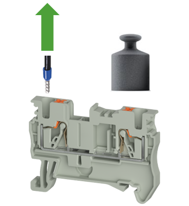 Die Feder ist so positioniert, dass sie keine Kräfte auf das Klemmengehäuse ausübt. Unabhängig davon, ob ein Leiter angeschlossen ist oder nicht.