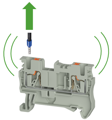 Der Leiter wird einfach bis zum Anschlag in die Klemmstelle gesteckt. Einmal in Position, hält ihn die Feder wie ein Widerhaken, ohne ihn zu beschädigen.