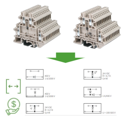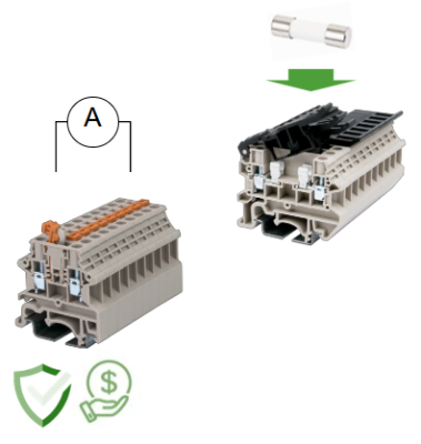 • For some applications with unstable current levels in the control loop DIN rail terminal blocks with fuses may be the best solution to protect machine from an unexpected power surges and thus save maintenance costs.​